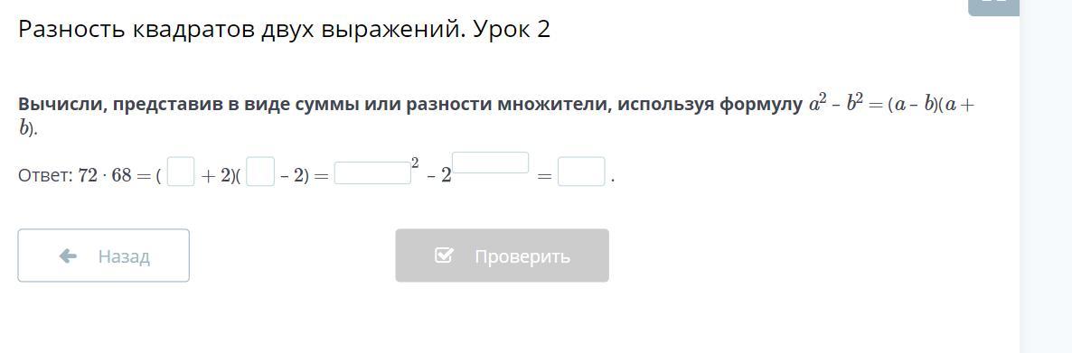 Вычисли, представив в виде суммы или разности множители, используя формулу a2 – b2 = (a – b)(a + b).