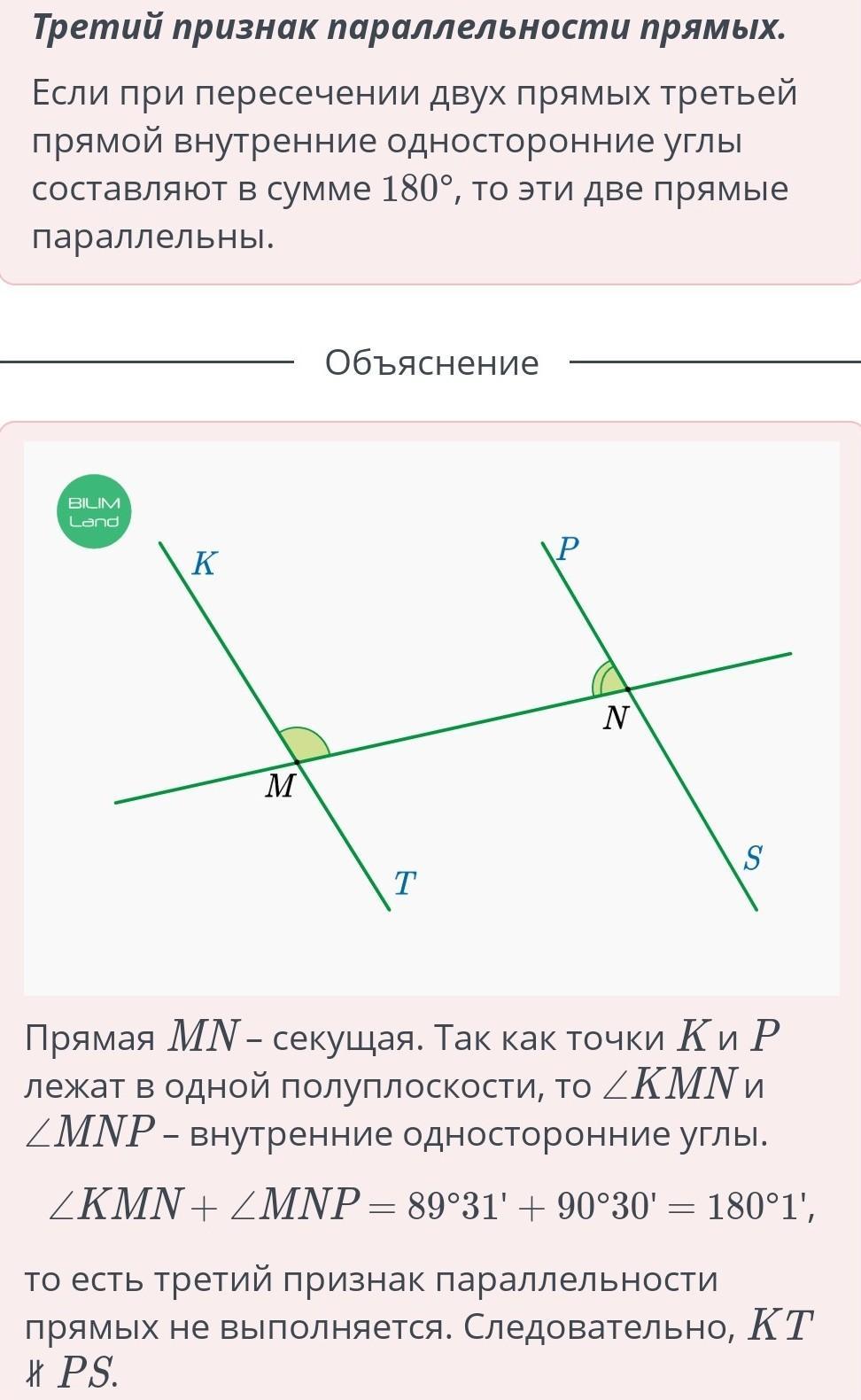 Прямая MN пересекает прямую KT в точке M, а прямую PS – в точке N. Точки K и P лежат в одной полуплоскости от прямой MN, а точки T и S – в другой полуплоскости. Параллельны ли прямые KT и PS, если ∠KMN = 89°31', ∠MNP = 90°30'?