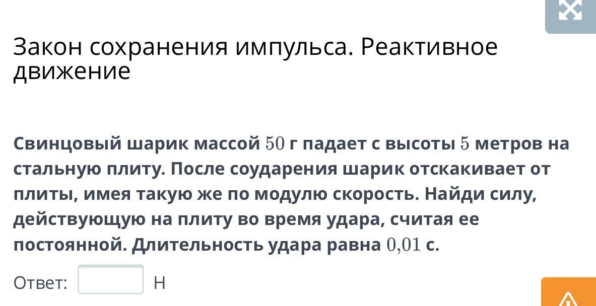F=2*m*√(2*g*h)/Δt=2*0.05*√(2*10*5)/0.01=100 H