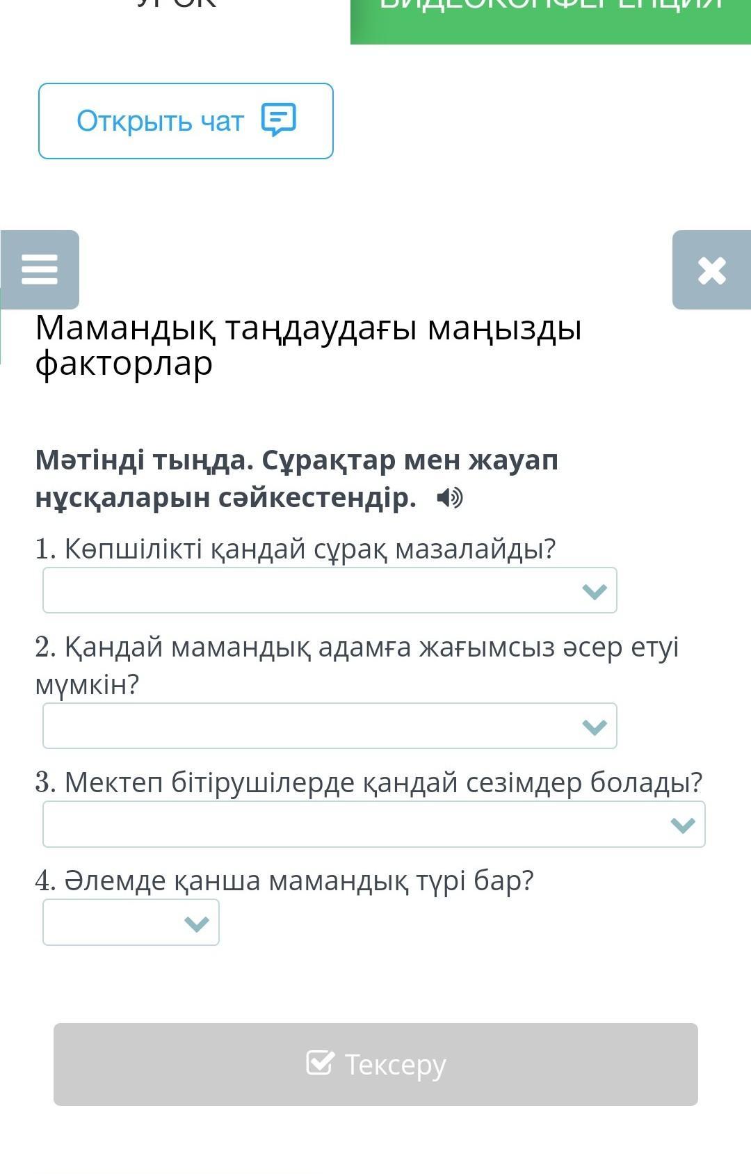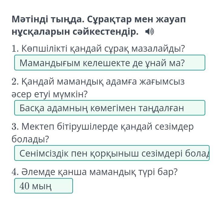 Мәтінді тыңда. Сұрақтар мен жауап нұсқаларын сәйкестендір.