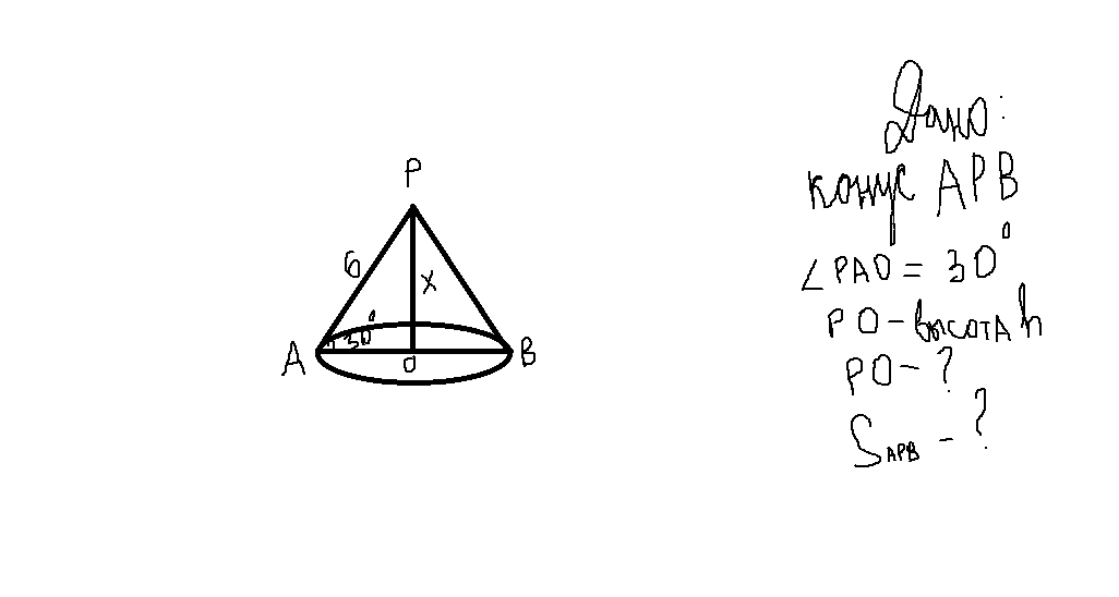 Образующая конуса AP наклонена к плоскости основания под углом в 30 градусов. Найти высоту конуса и площадь осевого сечения APB, если AP=6 см