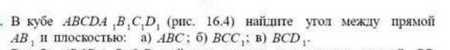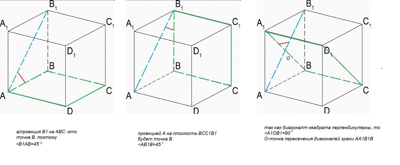 в кубе abcda1b1c1d найти угол между прямой ab1 и плоскостью 1) ABC, 2) BCC1, 3)BCD1