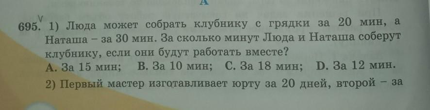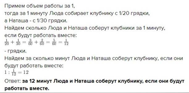 Ответ: за 12 минут Люда и Наташа соберут клубнику, если они будут работать вместе.
