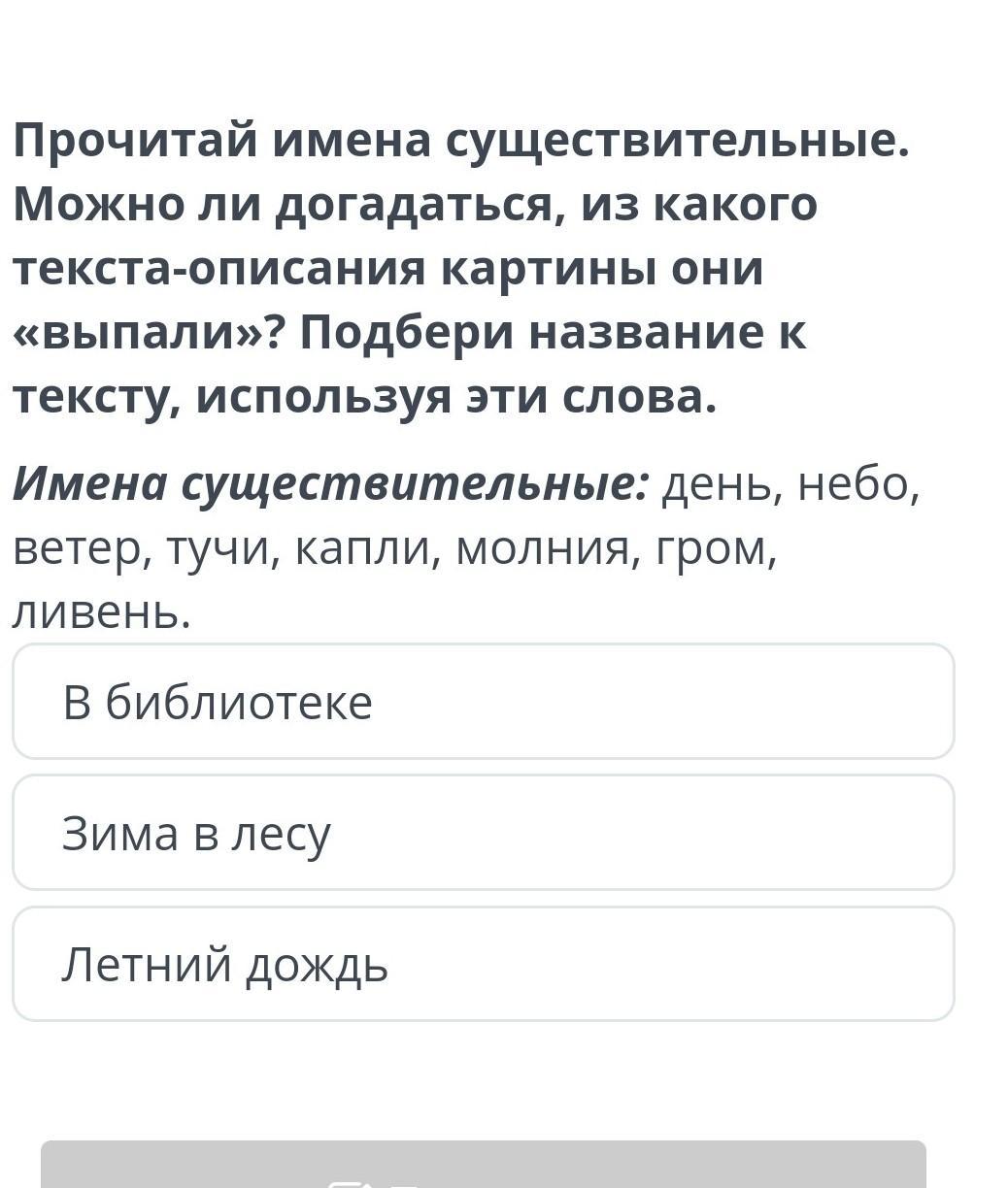 Прочитай имена существительные. Можно ли догадаться, из какого текста-описания картины они «выпали»? Подбери название к тексту, используя эти слова.