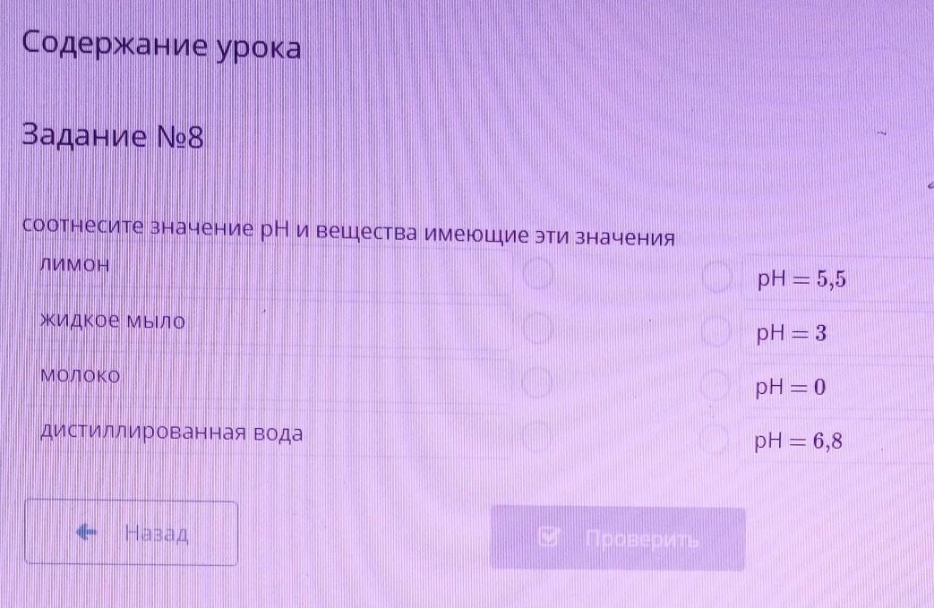 Соотнесите значение рН и вещества имеющие эти значения