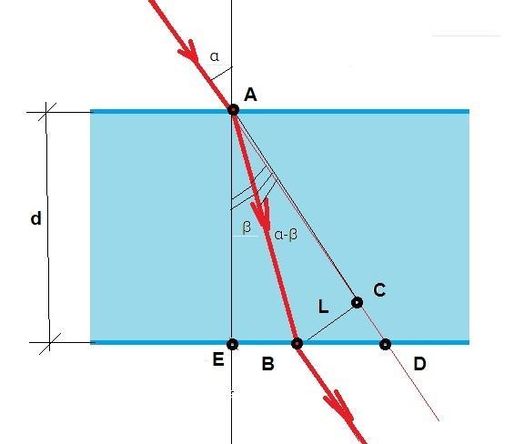 Луч падает на плоскопараллельную пластинку под углом 30 градусов. Показатель преломления стекла 1,5. Какова толщина пластинки, если смещение луча равно 3,88 см. ( рисунок к задаче )