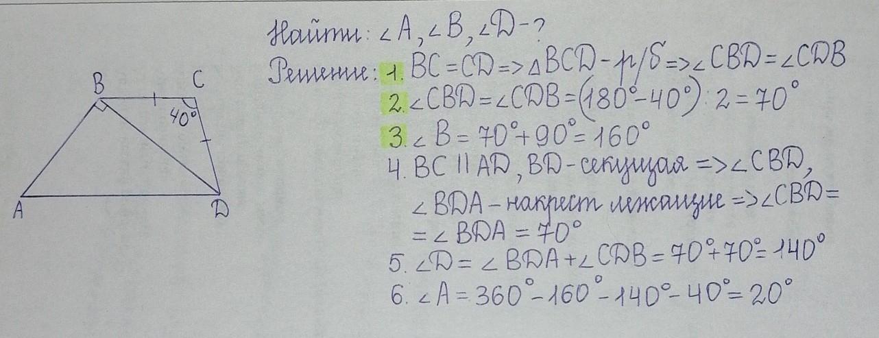 диагональ трапеции перпендикулярна боковой стороне , острый угол лежащий против этой диагонали равен 40°. Найдите остальные углы трапеции если меньшее основание равно другой боковой стороне. ПОМОГИТЕ ПОЖАЛУЙСТА!