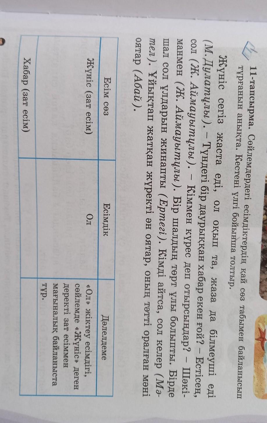 11-тапсырма. (109-бет) Сөйлемдердегі есімдіктердің қай сөз табымен байланысып тұрғанын анықтап, кестені үлгі бойынша толтырыңдар.