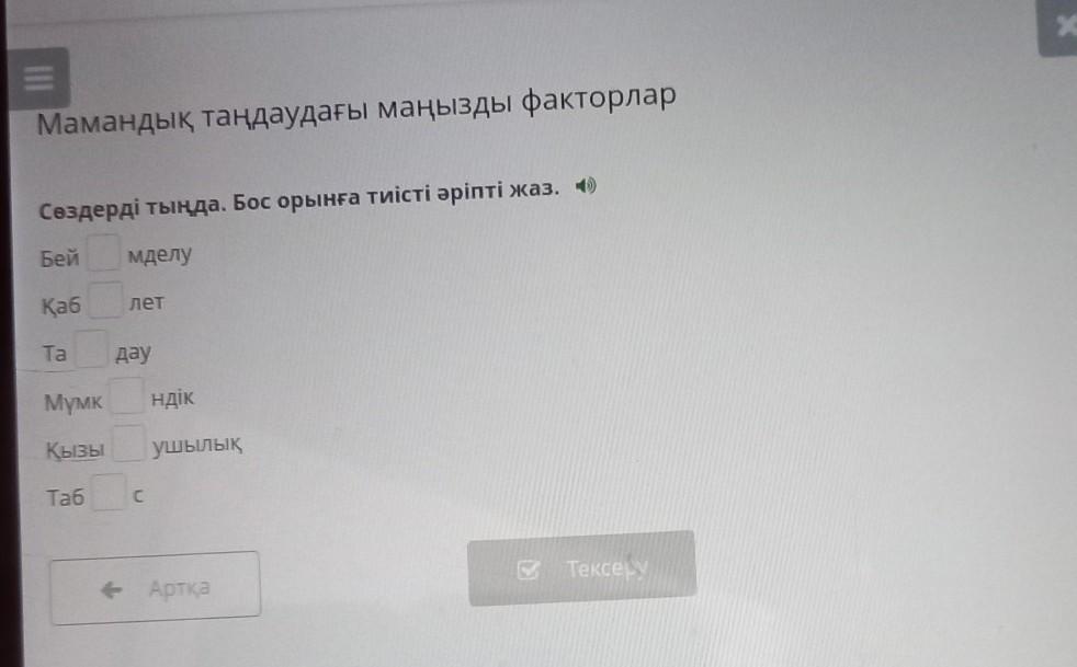 Сөздерді тыңда. Бос орынға тиісті әріпті жаз. (1)