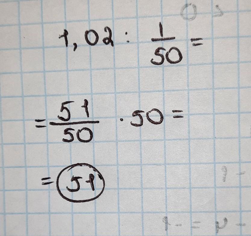 = 1 2/100 : 1/50 = 1 1/50 : 1/50 = 51/50 * 50/1 = 51/1 = 51