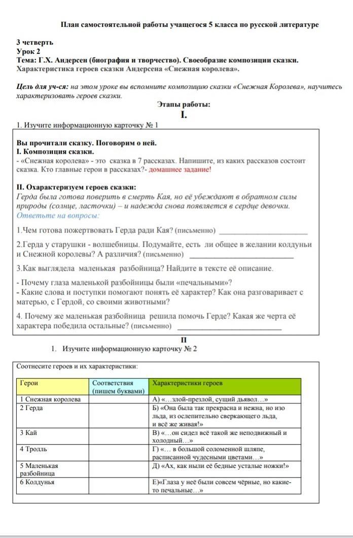 п 1. Изучите информационную карточку № 2 Соотнесите героев и их характеристики: Герои Снежная королева 2 Герда 3 Кай 4 Тролль 5 Маленькая разбойница 6 Колдунья Соответствия (пишем буквами) Характеристики героев А) «., злой-презлой, сущий дьявол...» Б) «Она была так прекрасна и нежна, но изо льда, из ослепительно сверкающего льда, и все же живая!» В) «...он сидел всё такой же неподвижный и холодный...» Г) «... в большой соломенной шляпе, расписанной чудесными цветами...». Д) «Ах, как ныли её бедные усталые ножки!» Е «Глаза у нее были совсем чёрные, но какие то печальные...»