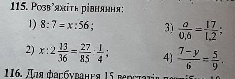 115 . 1) 8 : 7 = x : 56 ; -----> x = ( 8 * 56 )/7 = 64 ; -----> x = 64 ;