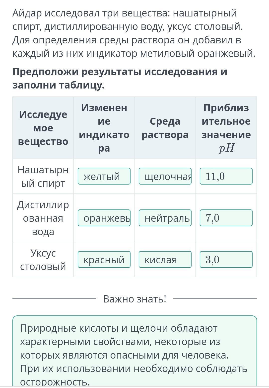Айдар исследовал три вещества: нашатырный спирт, дистиллированную воду, уксус столовый. Для определения среды раствора он добавил в каждый из них индикатор метиловый оранжевый.