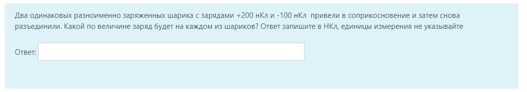 Два одинаковых разноименно заряженных шарика с зарядами +200 нКл и -100 нКл привели в соприкосновение и затем снова разъединили. Какой по величине заряд будет на каждом из шариков? Ответ запишите в НКл, единицы измерения не указывайте