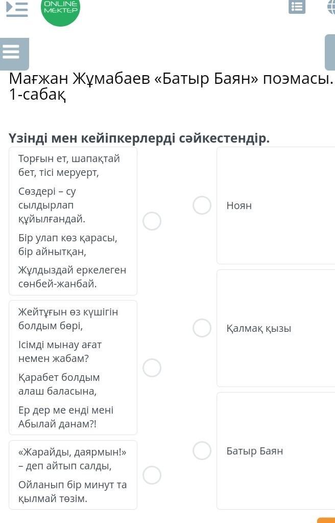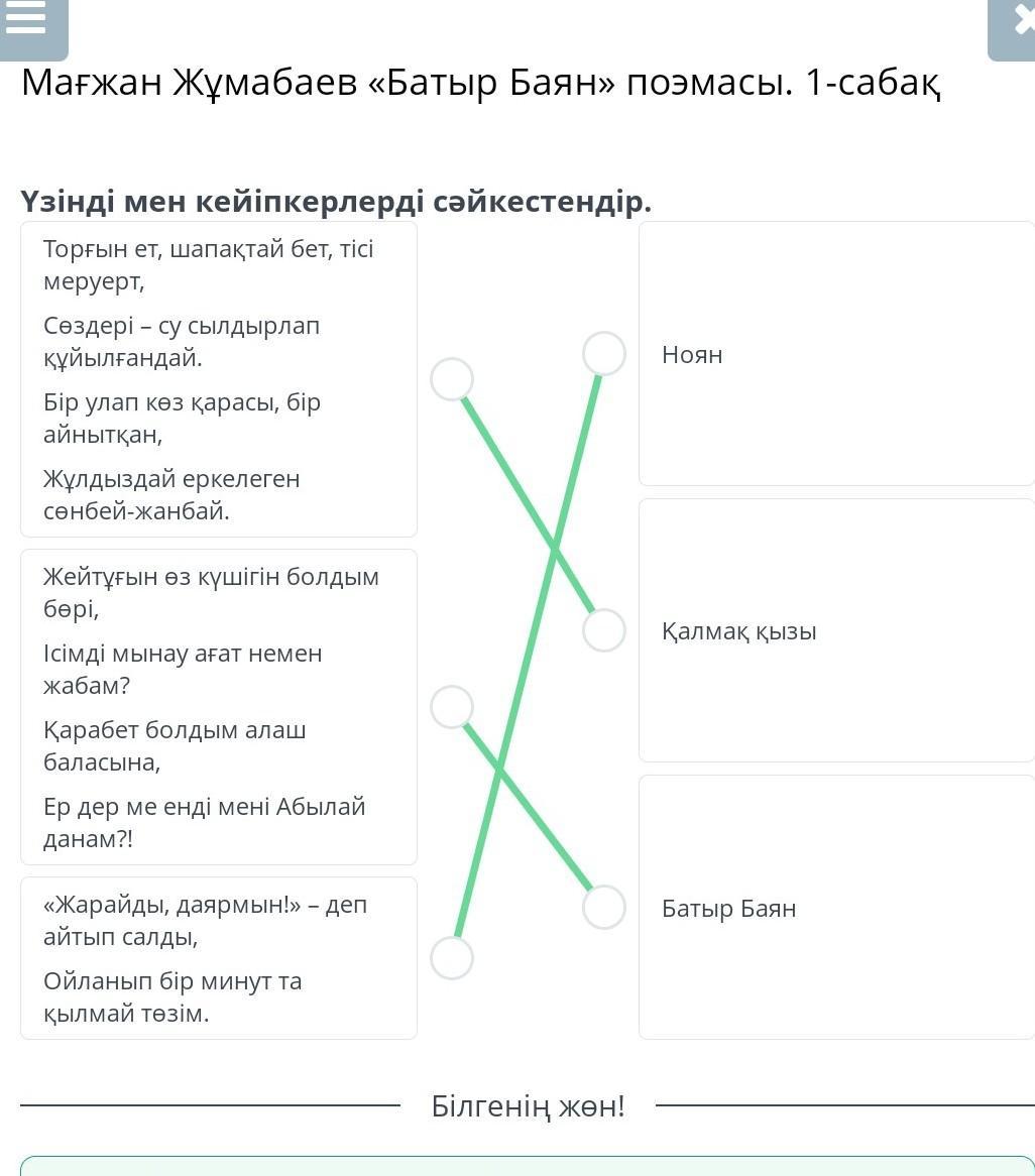 Үзінді мен кейіпкерлерді сәйкестендір.