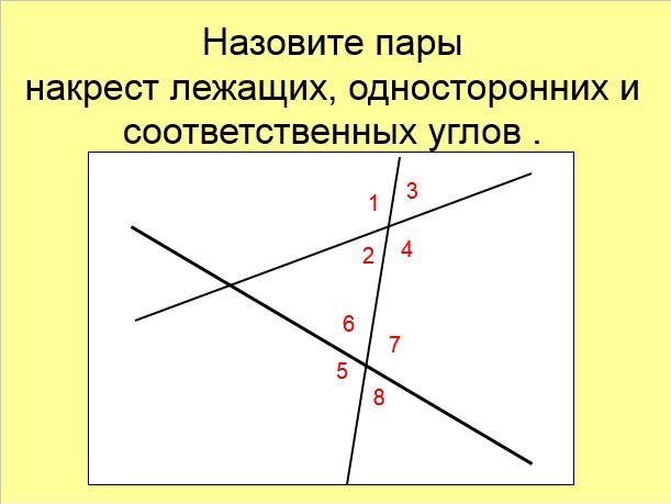 накрест лежащие углы: 1 4;2 3; 6 8; 5 7; 2 7; 6 4.
