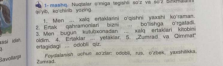 1. Men o'zbek xalq ertaklarini o'qishni yaxshi ko'raman. 2. Ertak qahramonlari bizni odobli bo'lishga o'rgatadi. 3. Men bugun kutubxonadan Zumrad xalq ertaklari kitobini oldim. 4. Ertaklar yaxshilikka yetaklar. 5. Zumrad va Qimmat ertagidagi o'zbek odobli qiz