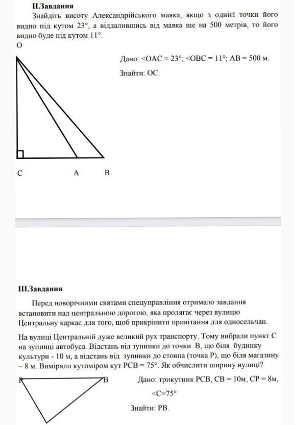 найдиье высоту Александрийского маяка, если с одной точки его видно под углом 23°, а удалившись от маяка на 500 метров, то он виден будет пож углом 11°. Дано: уголОАС=23°, уголОВС=11°, АВ=500 метров. Найти: ОС