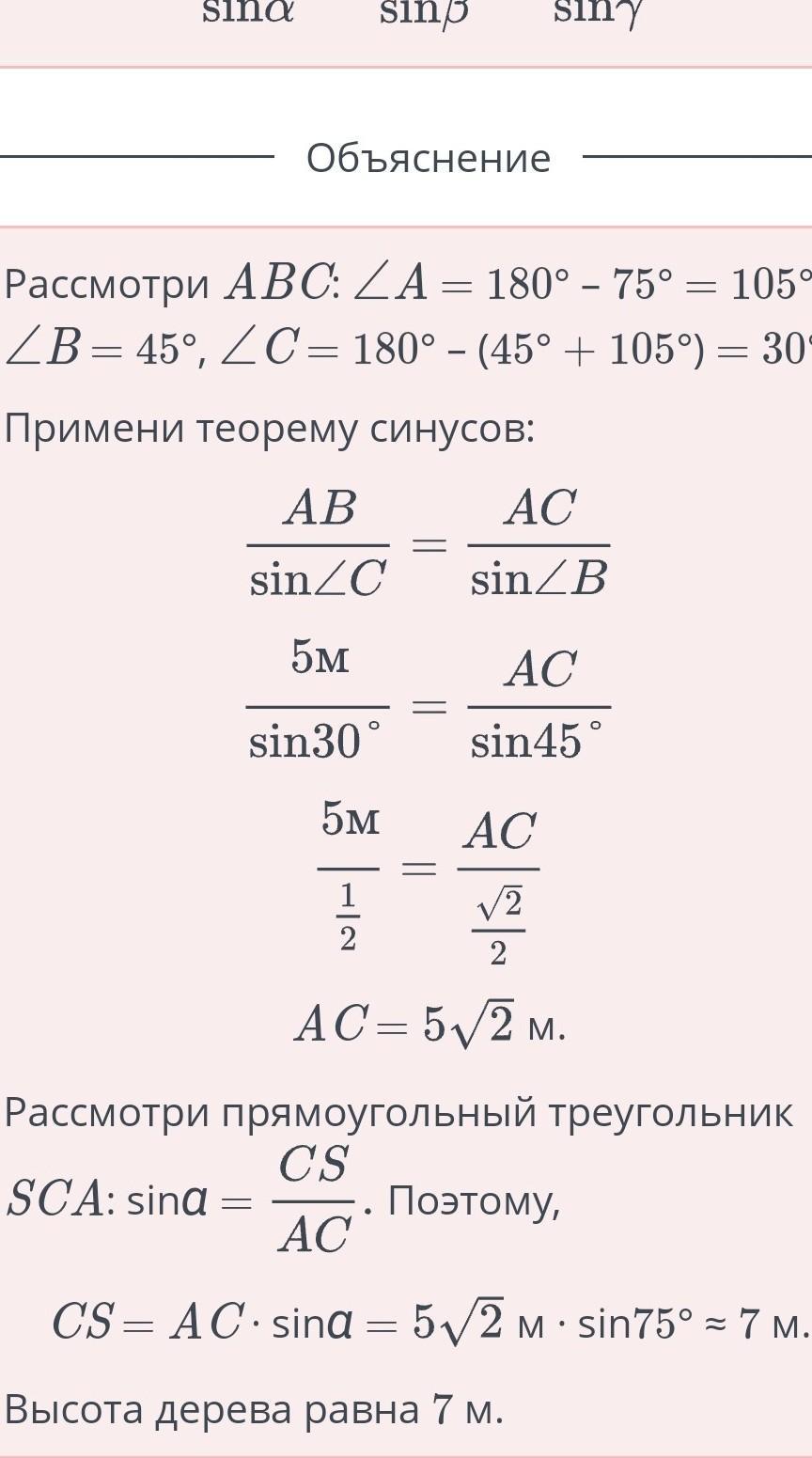 Для определения высоты дерева Бауыржан измерил расстояние AB = 5 м и углы α = 75°, β = 45°. Найди высоту дерева, используя для нахождения значений синусов «Четырехзначные математические таблицы» или микрокалькулятор. Ответ округли до целых (sin75°≈1).