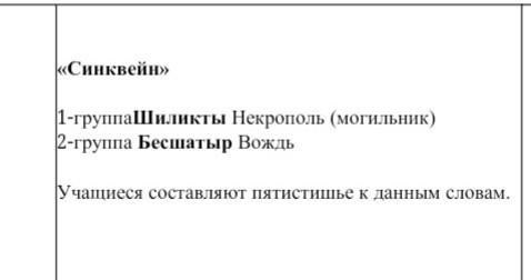Синквейн»1-группаШиликтыНекрополь (могильник)2-группаБесшатырВождьУчащиеся составляютпятистишье к данным словам