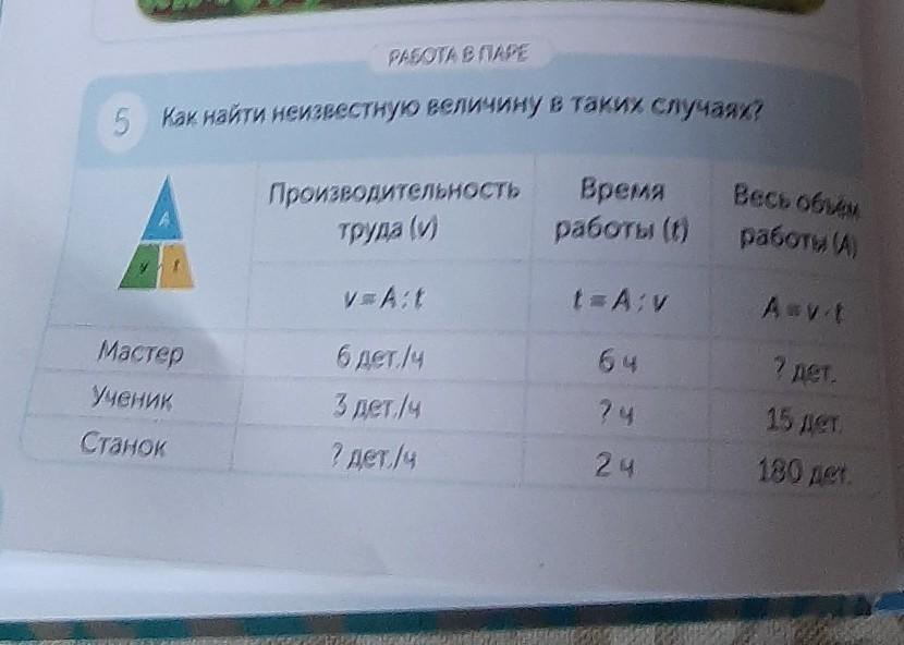 Если неизвестно время или скорость то нужно ВСЕГО(обьём,путь и.т.д 3 столбик)разделить на известную скорость или время.А если не известно ВСЕГО(3 столбик)то нужно время и скорость умножить