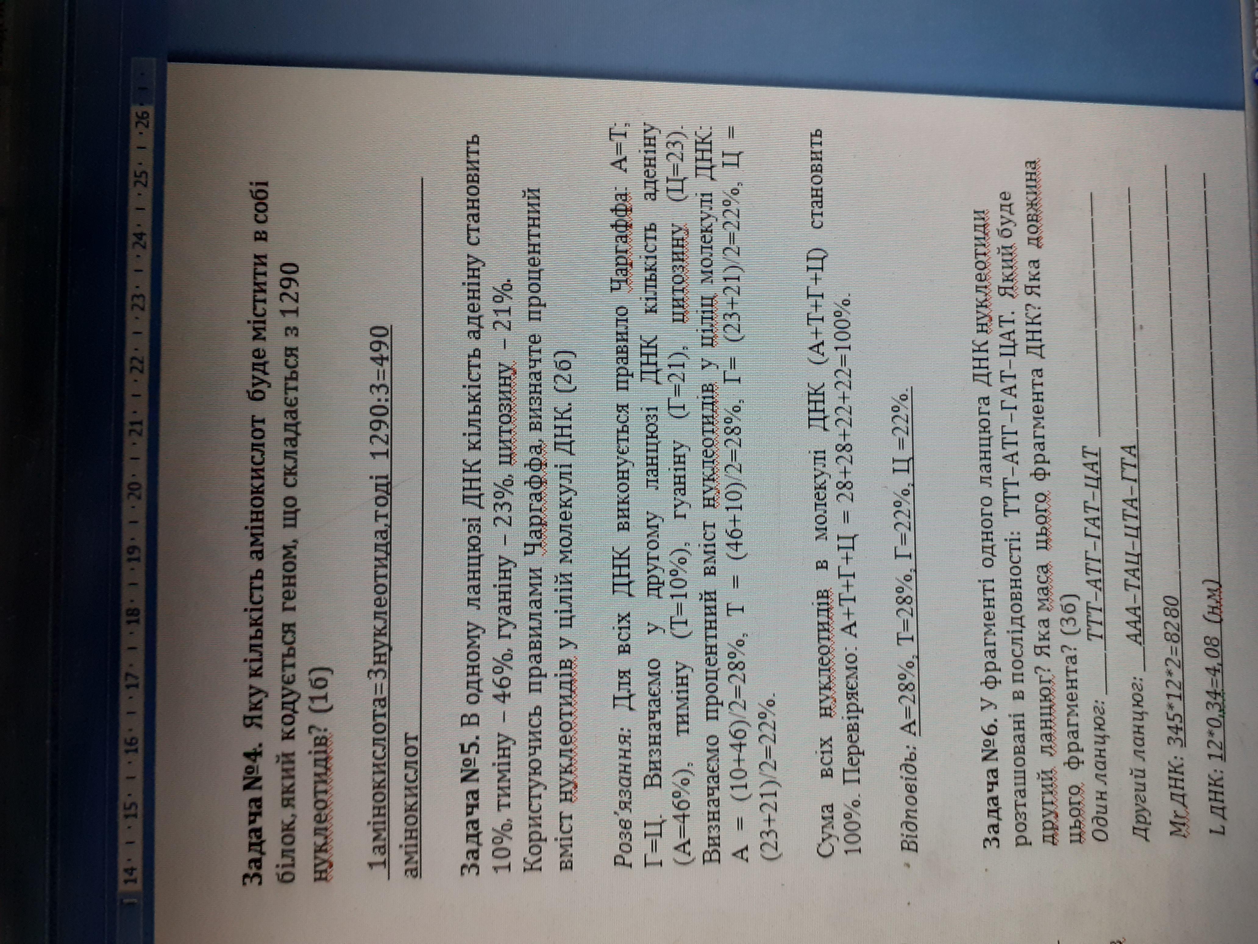 Задача №4. Яку кількість амінокислот буде містити в собі білок, який кодується геном, що складається з 1290 нуклеотидів? (1б)
