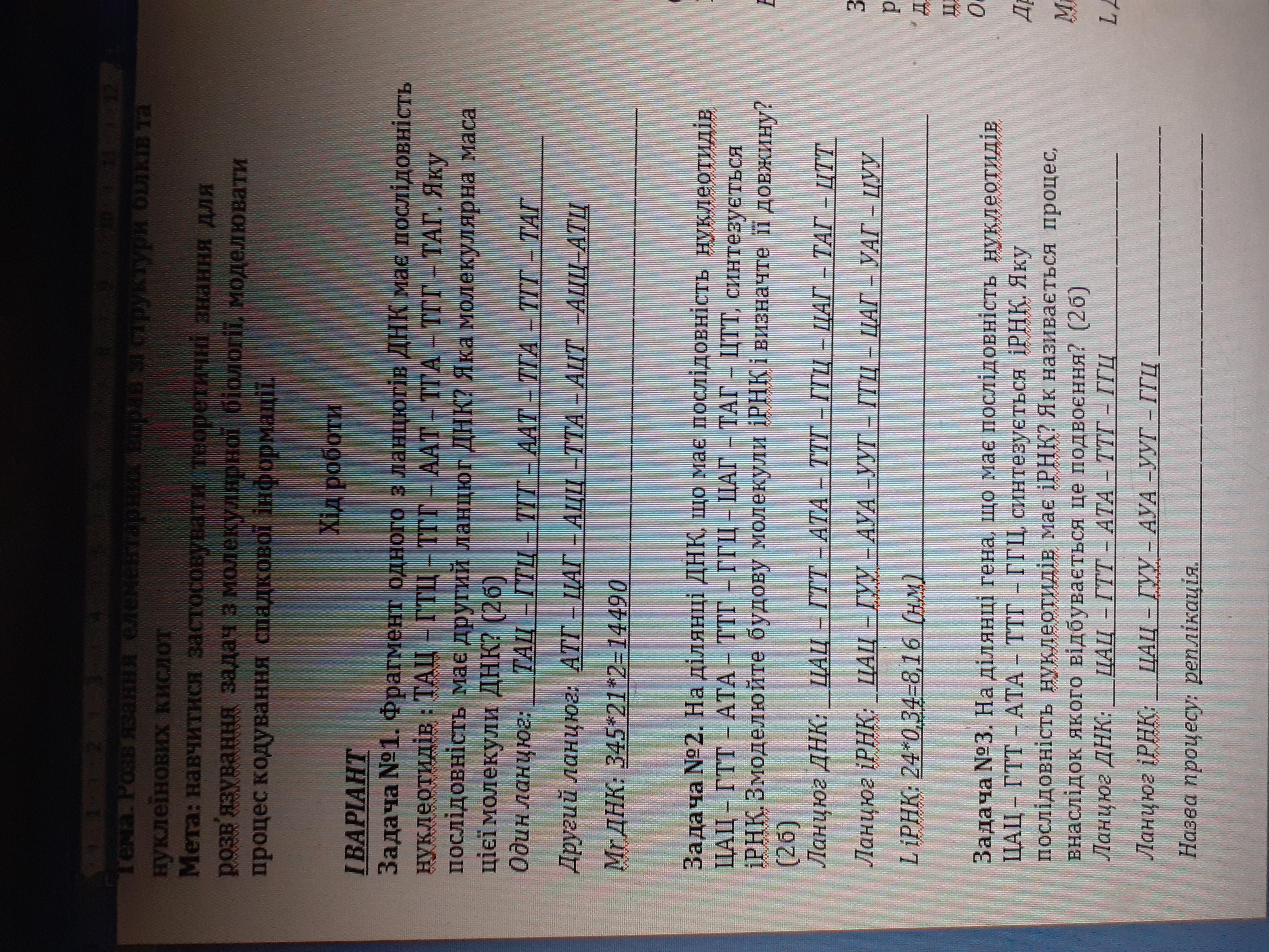 Задача №1. Фрагмент одного з ланцюгів ДНК має послідовність нуклеотидів : ТАЦ – ГТЦ – ТГГ – ААТ – ТГА – ТГГ – ТАГ. Яку послідовність має другий ланцюг ДНК? Яка молекулярна маса цієї молекули ДНК? (2б)
