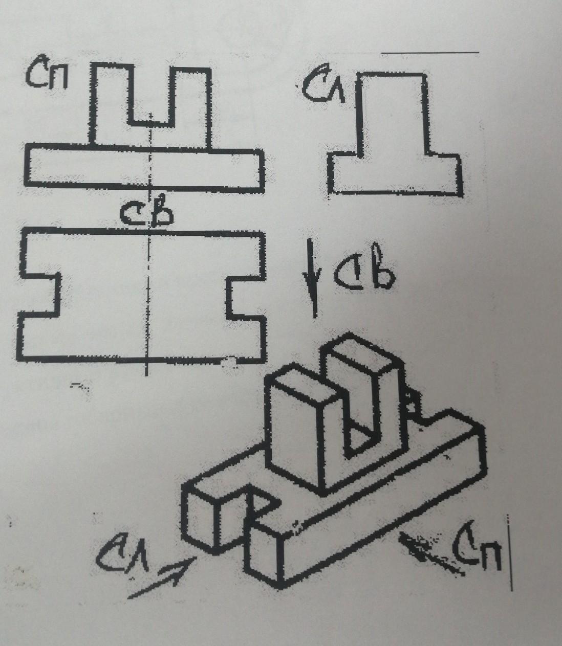 2. Руководствуясь, наглядным изображением детали, дополните чертеж