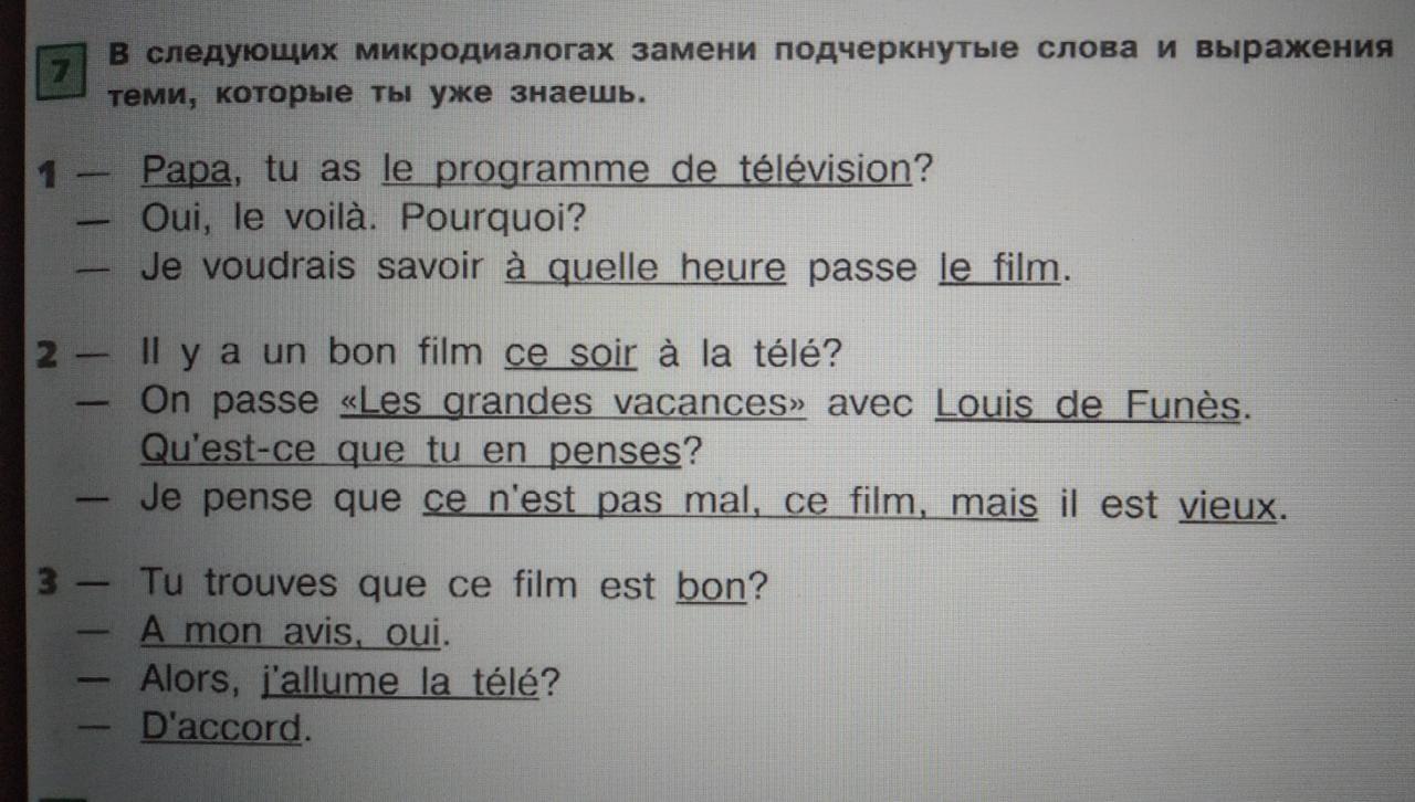 7. В следующих микродиалогах замени подчеркнутые слова и выражения теми, которые ты уже знаешь