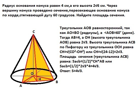помогите решить радиус основания конуса равен 4 см,а его высота 2√6 см.через вершину конуса проведено сечение,пересекающее основание конуса по хорде,стягивающей дугу 60 градусов.найдите площадь сечения.