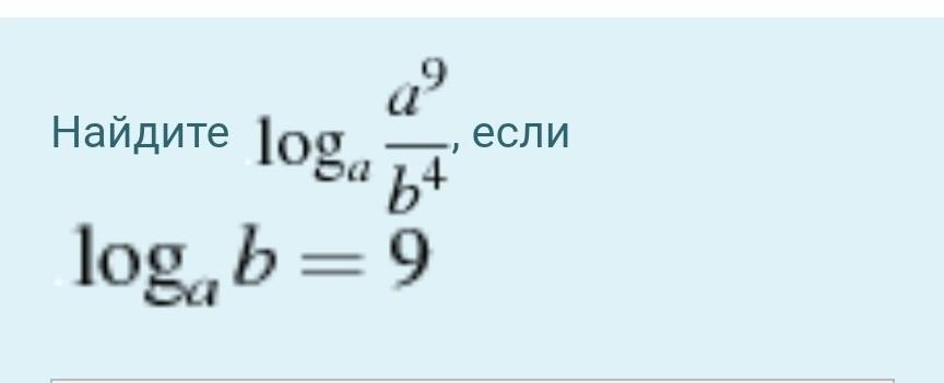 log_{a}( \frac{ {a}^{9} }{ {b}^{4} } )  =  log_{a}( {a}^{9} )  -  log_{a}( {b}^{4} )  =  \\  = 9 - 4 log_{a}(b)  =  \\  \\  = 9 - 4 \times 9 = 9 - 36 =  - 27