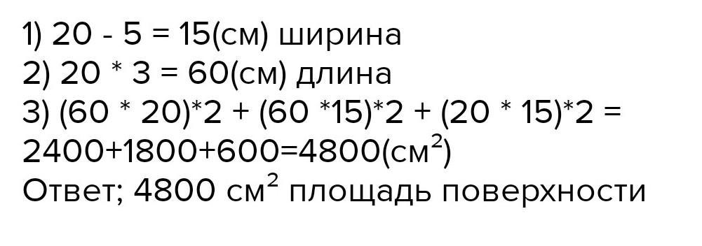 Высота прямоугольного параллелепипеда равна 20 см,что на 5 см больше его ширины и в 3 раза меньше его длины.Вычислите площадь поверхности параллелепипеда. УСЛОВИЕ пожалуйста