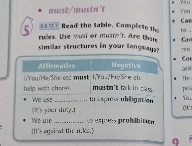 Read the table. Complete the rules. Use must or mustn't. Are there similar structures in your language