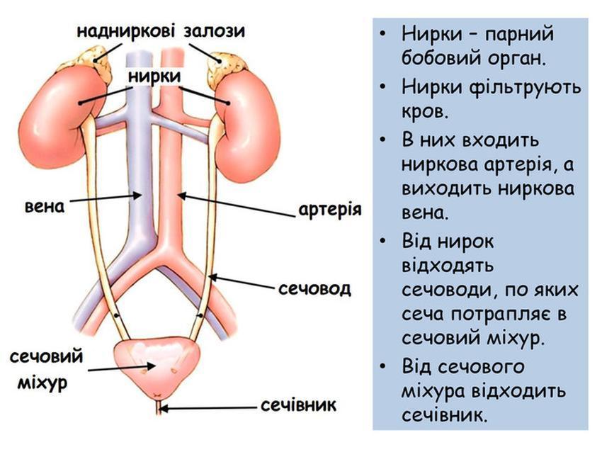 Написати схему органів що виконують видільну функцію в організмі людини, замалювати у зошит внутрішню будову нирки й нефрона