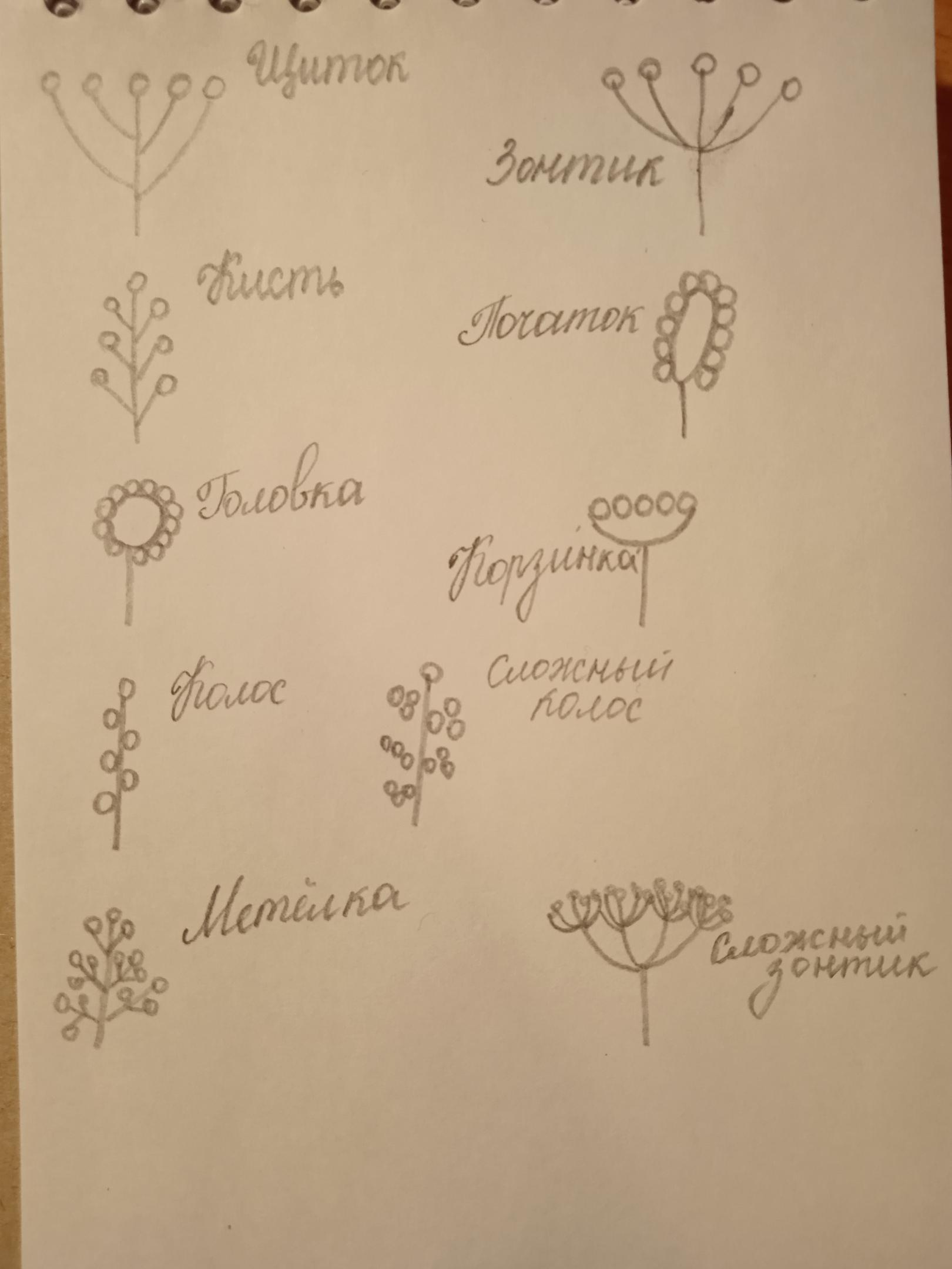 6.Корзинка- состоит из расширенной в виде диска оси, на которой "сидят" цветки, окружённые общей обёрткой. (Подсолнечник, астра)