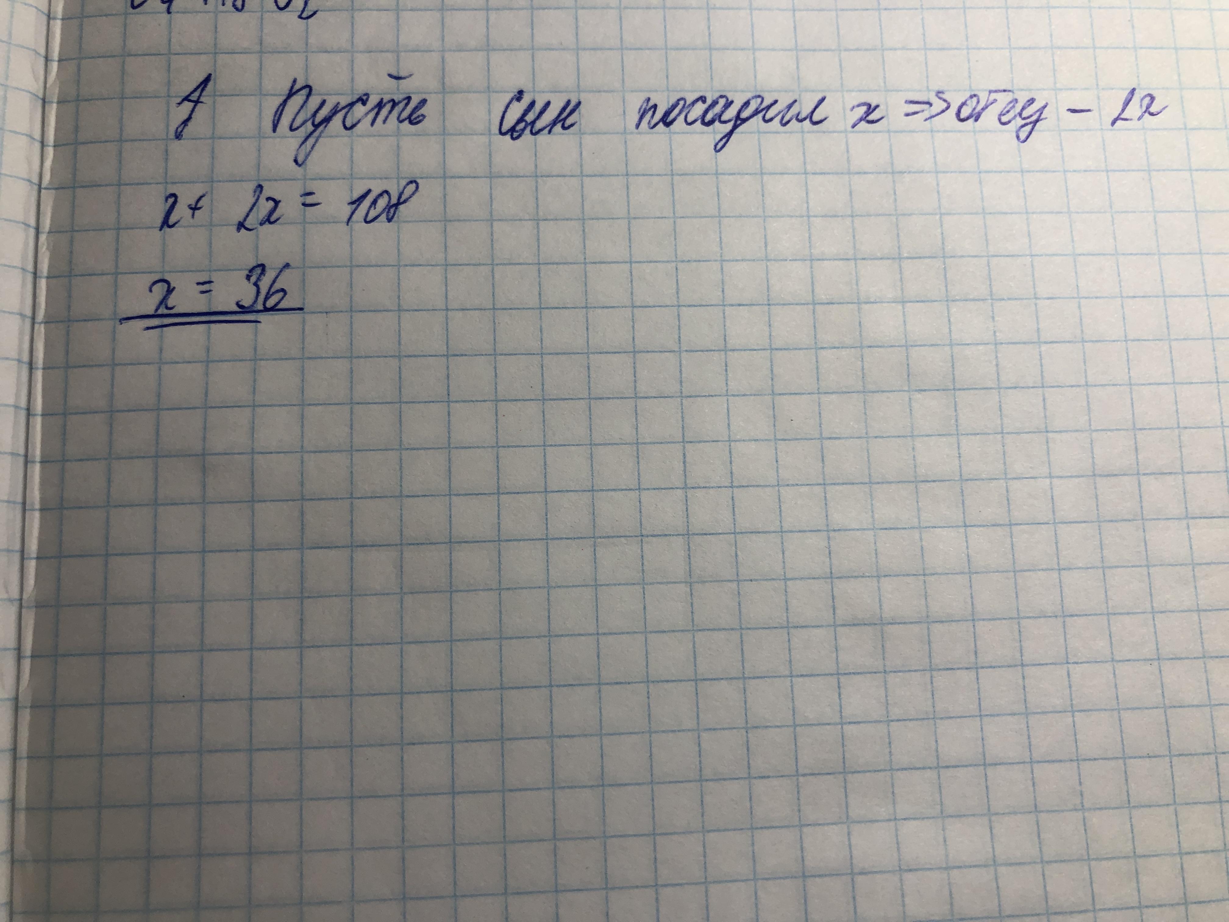 Отец с сыном посадили 108 кустов помидоров , отец посадил в 2 раза больше , чем сын . Сколько кустов посадил сын ?