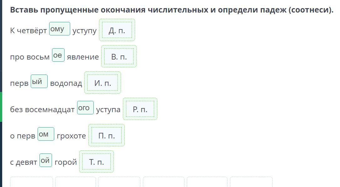Вставь пропущенные окончания числительных и определи падеж (соотнеси),