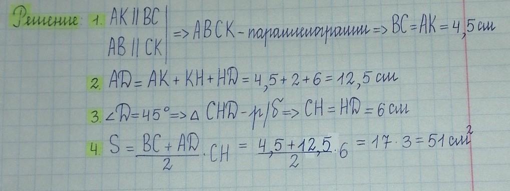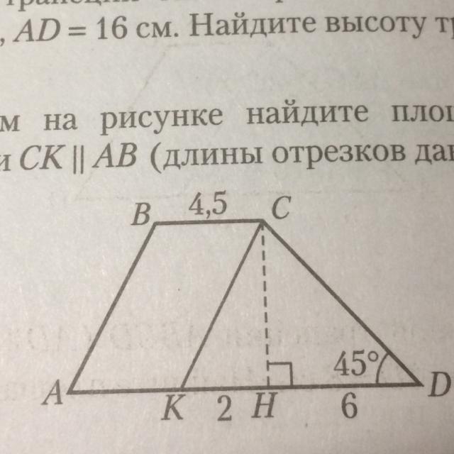 По данным на рисунке найдите площадь трапеции АВСД если СК||АВ(длины отрезков даны в см)