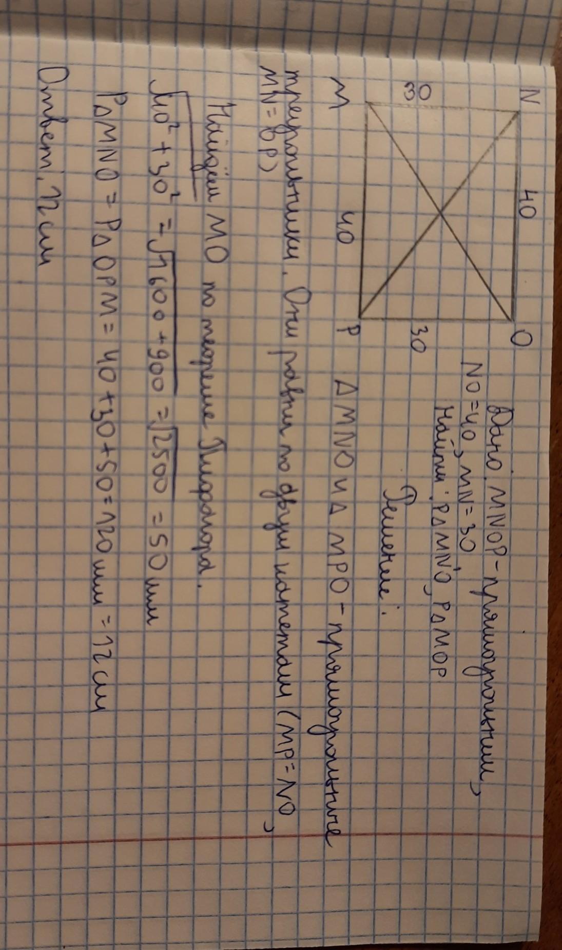 начертить промоугольник MNOP с сторонами 30 и 40 мм. Переведите диоганали . найти периметр треугольников MNO и MOP
