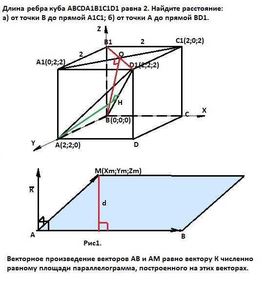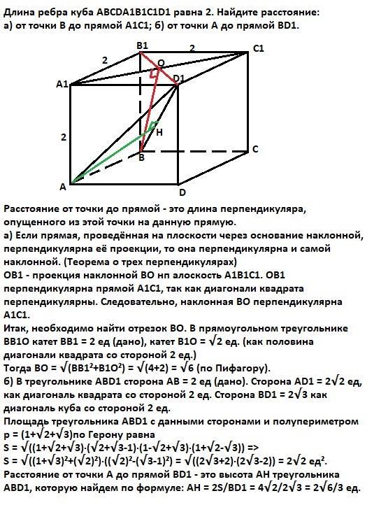 Длина рёбра куба ABCDA1B1C1D1 равна 2. Найдите расстояние: а) от точки B до прямой A1C1; б) от точки А до прямой BD1.