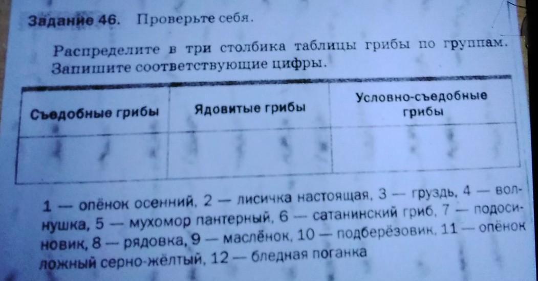 Распределите в 3 столбика таблицы грибы по группам и запишите их в соответствующие цифры