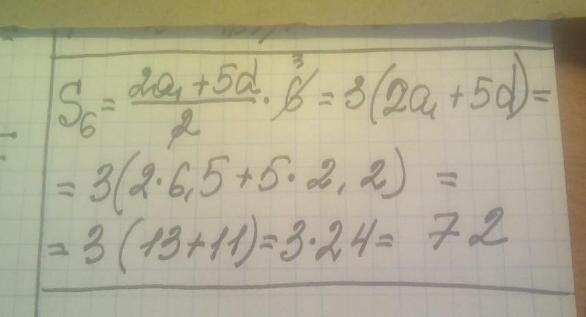 Дана арифметическая прогрессия (an). Известно, что a1 = 6,5 и d = 2,2. Вычисли сумму первых шести членов арифметической прогрессии.