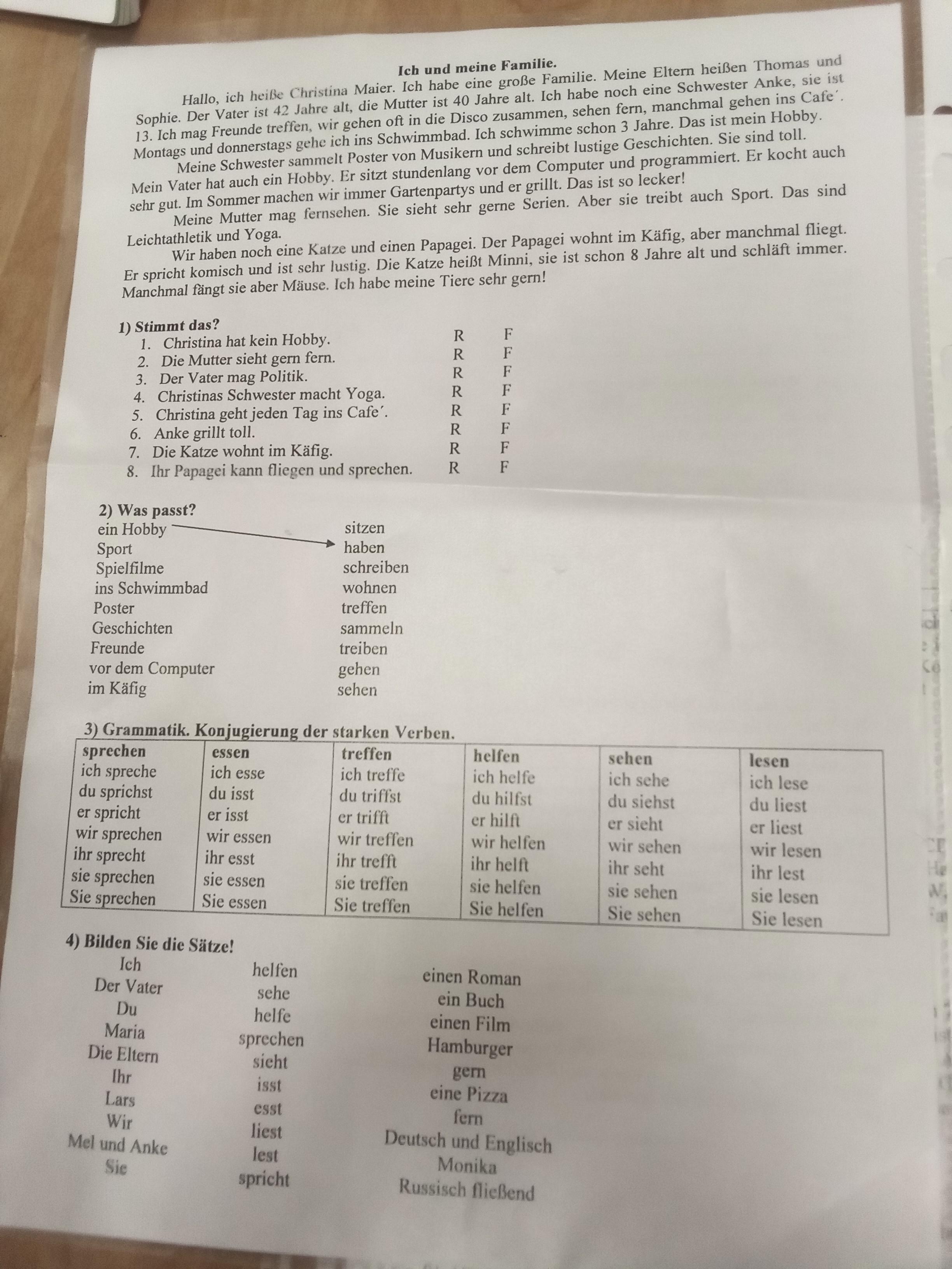 Ich und meine Familie. Hallo, ich Christina Maier. Ich habe eine große Familie. Meine Eltern heißen Thomas und Sophie. Der Vater ist 42 Jahre alt, die Mutter ist 40 Jahre alt. Ich habe noch eine Schwester Anke, sie ist 13. Ich mag Freunde treffen, wir gehen oft in die Disco zusammen, sehen fern, manchmal gehen ins Cafe Montags und donnerstags gehe ich ins Schwimmbad, Ich schwimme schon 3 Jahre. Das ist mein Hobby. Meine Schwester sammelt Poster von Musikern und schreibt lustige Geschichten. Sie sind toll.
