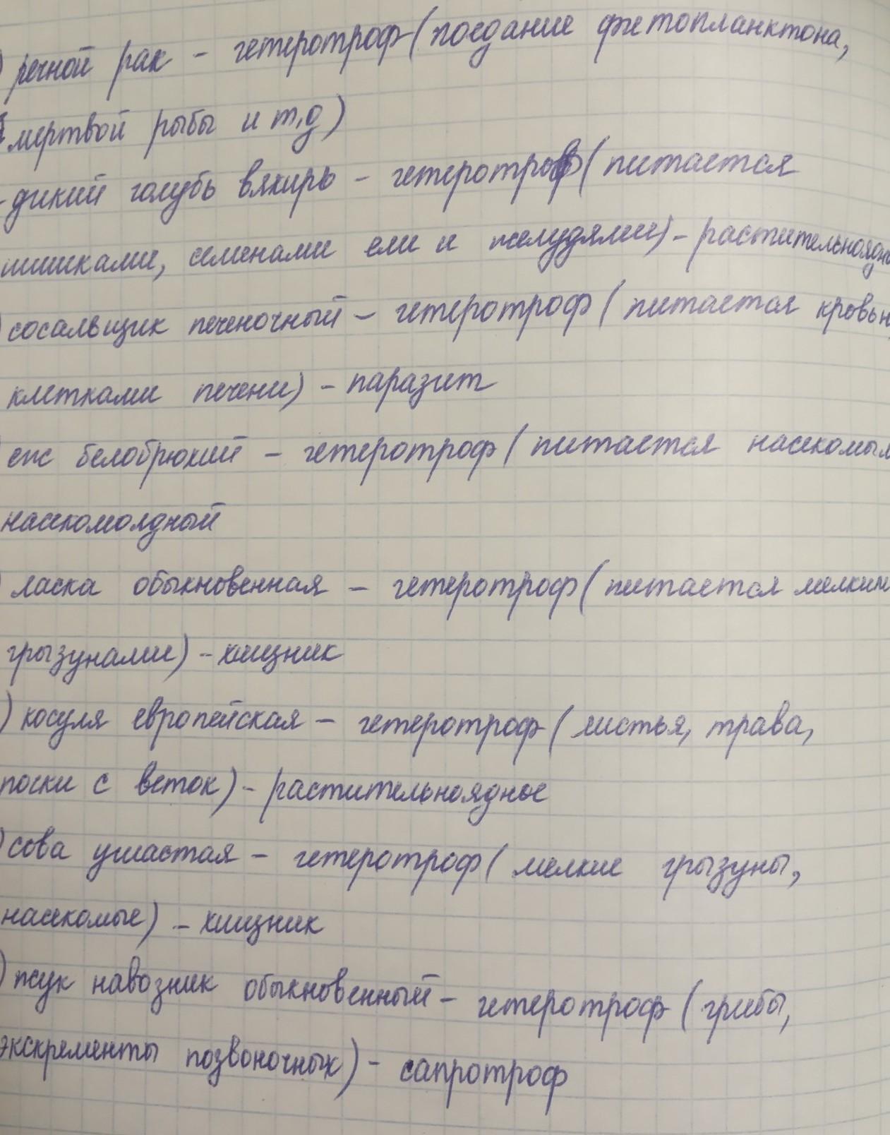 способ питания речного рака,дикого голубя вяхирь, сосальщик печеночный, еж белобрюхого, ласка обыкновенная, косуля европейская,сова ушастая жук навозник обыкновенный