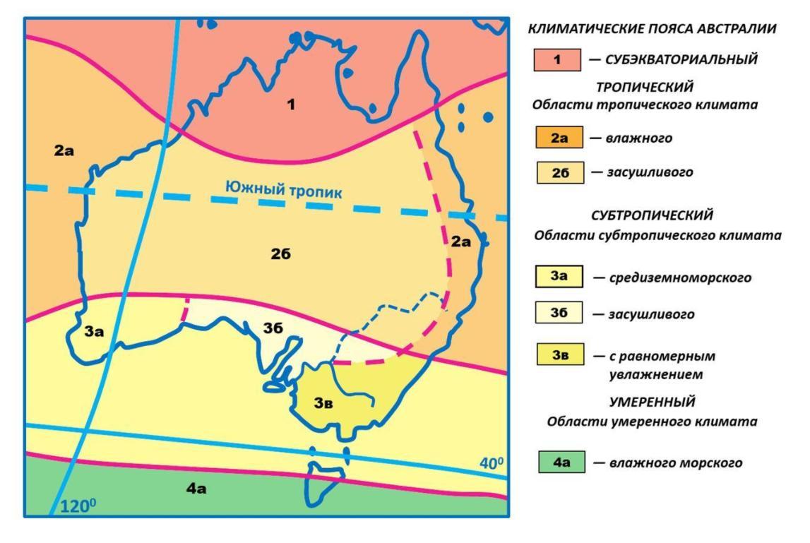 Если мы посмотрим на карту климатических поясов Австралии, которая дана ниже в приложении, то увидим, что наиболее благоприятный климат для проживания и хозяйственной деятельности человека расположен на восточном и юго-восточном побережье материка.Здесь климат тропический влажный (на востоке), или субтропический с равномерным увлажнением (на юго-востоке).