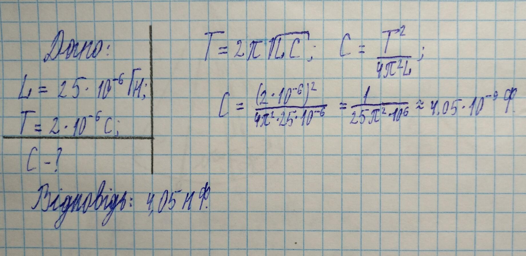 Яку ємність повинен мати конденсатор у коливальному контурі, що містить, крім того, котушку індуктивністю 25 мкГн, якщо період вільних електромагнітних коливань у цьому контурі 2 мкс?