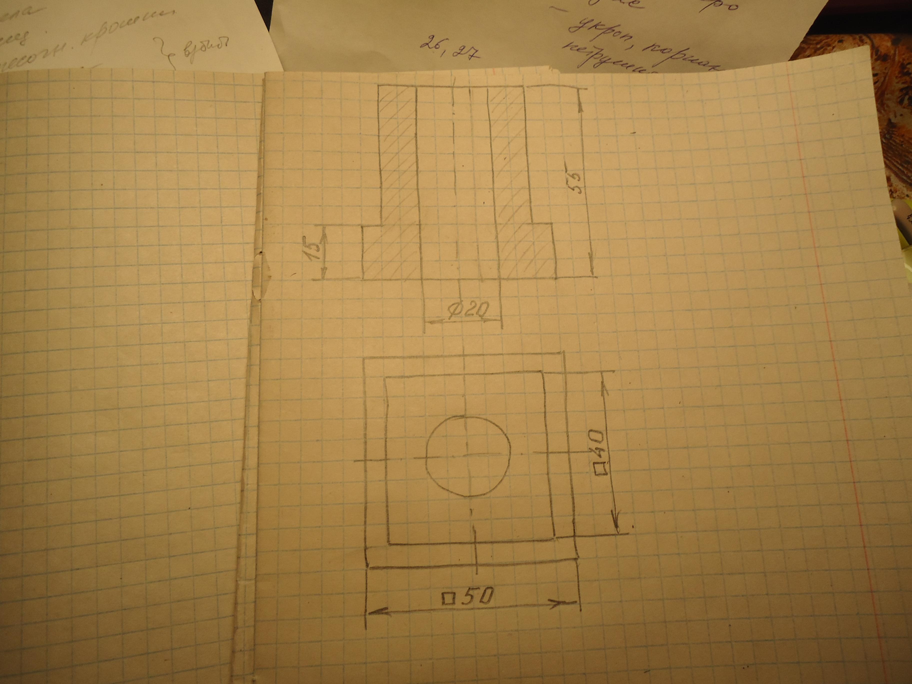 Виконати переріз деталі що складається з призми 50х50х15на якій розміщено куб зі стороною квадрату40Через всю деталь проходить вертикальний отвір діаметром 20