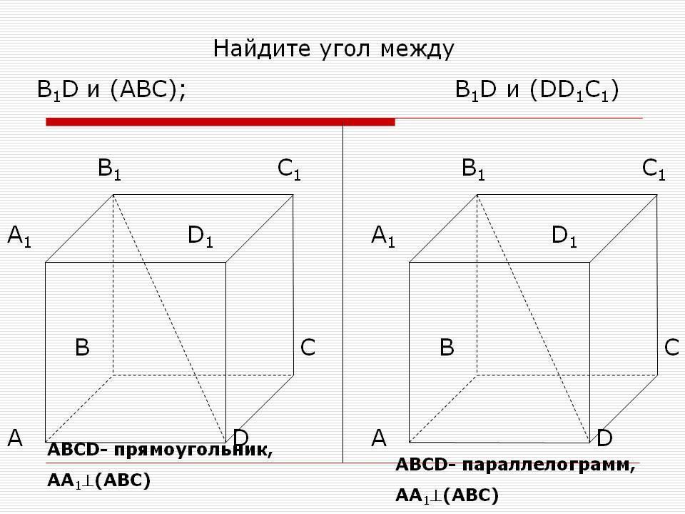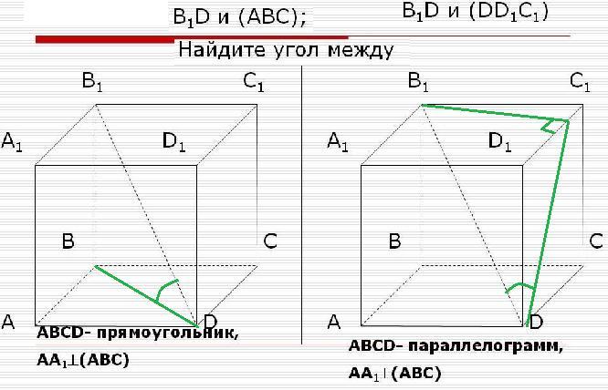 Найдите угол между В1D и (ABC); В1D и (DD1C1)