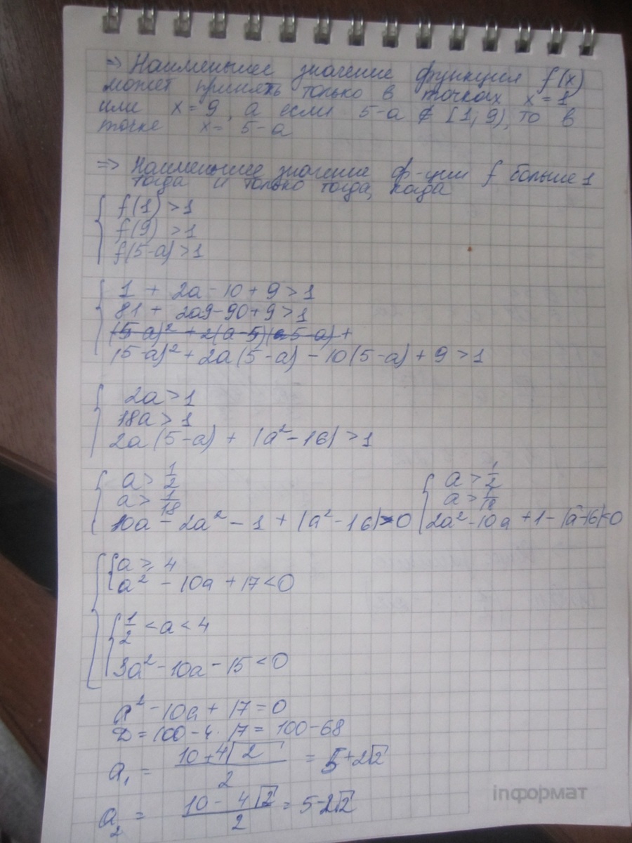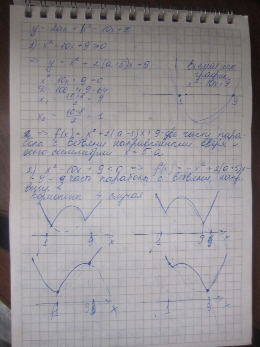 y=2ax+|x²-10x+9|все значения параметра а, при каждом из котором наименьшее значение функции больше 1.