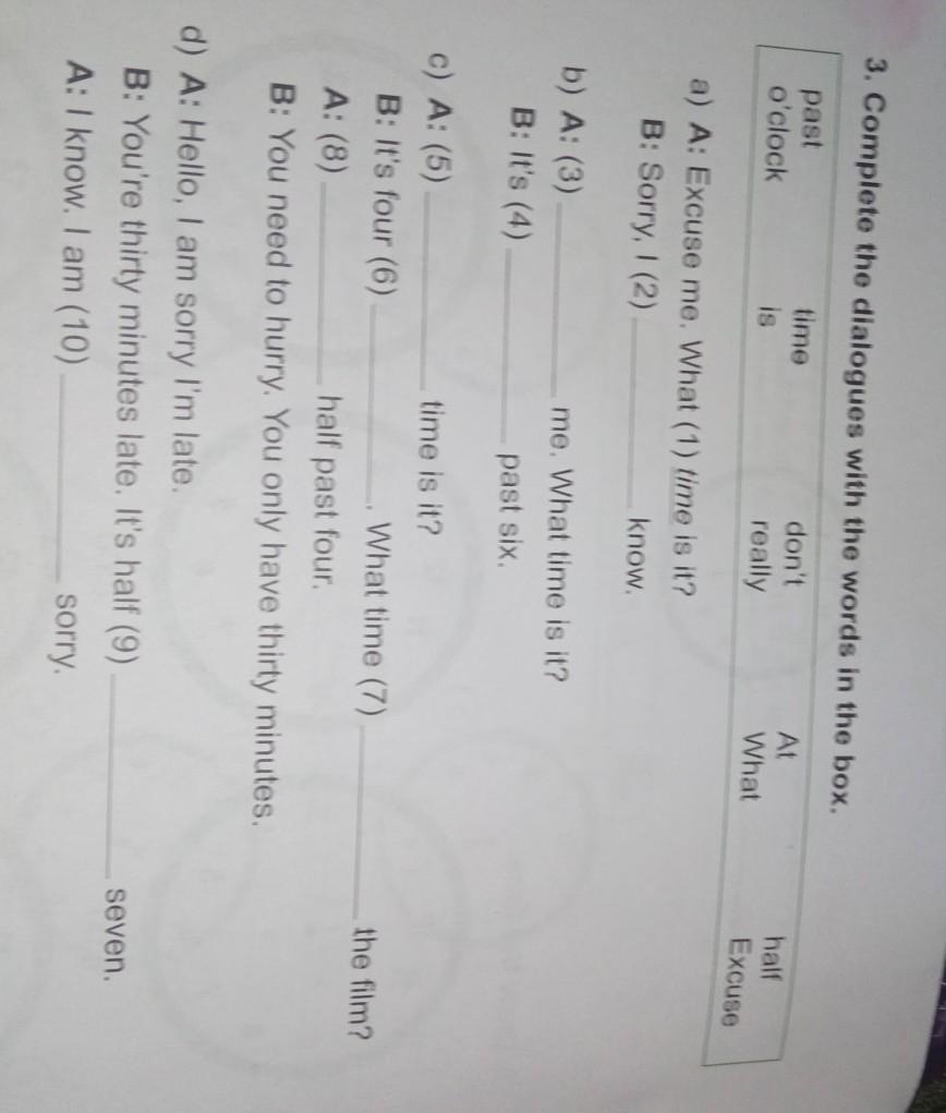 3. Complete the dialogues with the words in the box. past o'clock time is don't really a) A: Excuse me. What (1) time is it? B: Sorry, I (2) (2)\ b) A: (3) (3)\ B: It's (4) c) A: (5) B: It's four (6) know. me. What time is it? past six time is it? What time (7) half past four A: (8) B: You need to hurry. You only have thirty minutes d) A: Hello, I am sorry I'm late. B: You're thirty minutes late. It's half (9) A: I know. I am(10)\ sorry. AL What half Excuse the film? seven